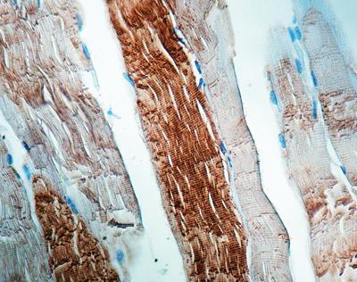Alpha Actinin^ Clone number EA-53. This antibody is specific for alpha-skeletal muscle actinin and alpha-cardiac actinin. It stains Z lines and dots in stress fibers of myotubes in skeletal and cardiac muscle but not in non-sarcomeric muscle elements. This antibody shows wide range of cross reactivity with various mammalian species.