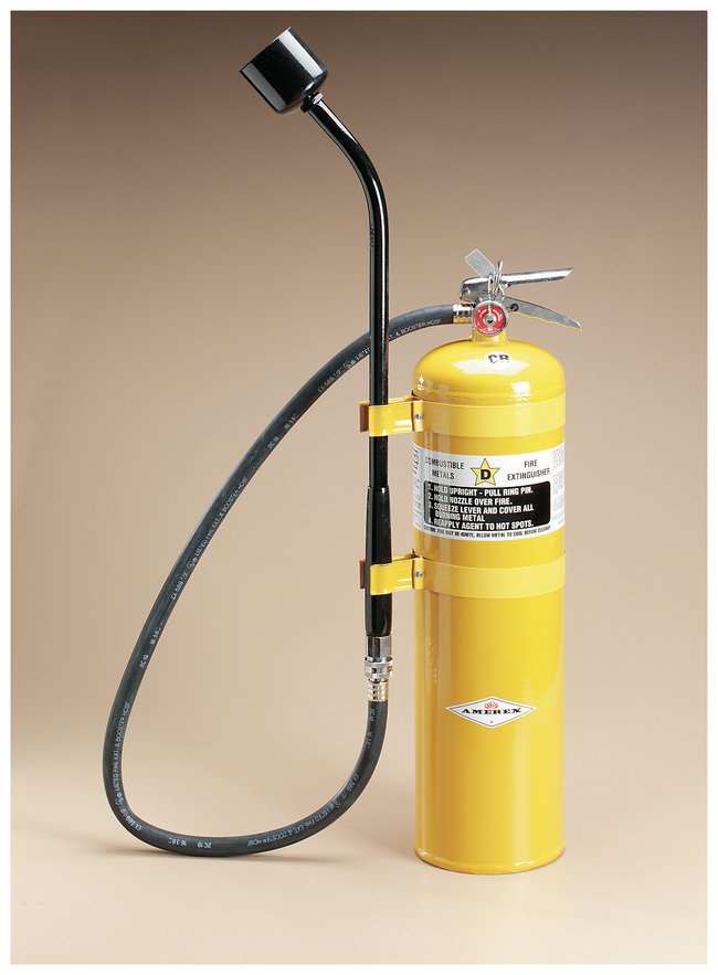 Both extinguishers feature dependable drawn steel cylinders, all-metal valve construction and special corrosion resistant yellow (Class D) color-coded paint finish.Sodium Chloride ExtinguisherContains a specially blended sodium chloride-based dry powder extinguishing agentHeat from fire causes sodium chloride to cake and form a crust, excluding air and dissipating heat from burning metalSuccessfully extinguishers fires involving magnesium, sodium, potassium and sodium-potassium alloys Zirconium, uranium, titanium, and powdered aluminum fires can be controlled and extinguishedCopper ExtinguisherContains a copper extinguishing agent specially developed by the U.S. Navy for fighting lithium and lithium alloy firesCopper compound smothers the fire and provides an excellent heat sink for dissipating heatCopper powderis superior to other known fire extinguishing agents for lithiumOrder InfoCapacity: 30 lb. (13.6kg). Shipping weight: 53 lb. (24kg). Dimensions: 7D × 16W × 27.75H in. (17.8 × 40.6 × 70.5cm). Larger capacity and wheeled extinguishers also available. Contact your Fisher Safety Customer Service Representative for ordering information.CertificationsFM approved.Warranty and ServicesSix years.