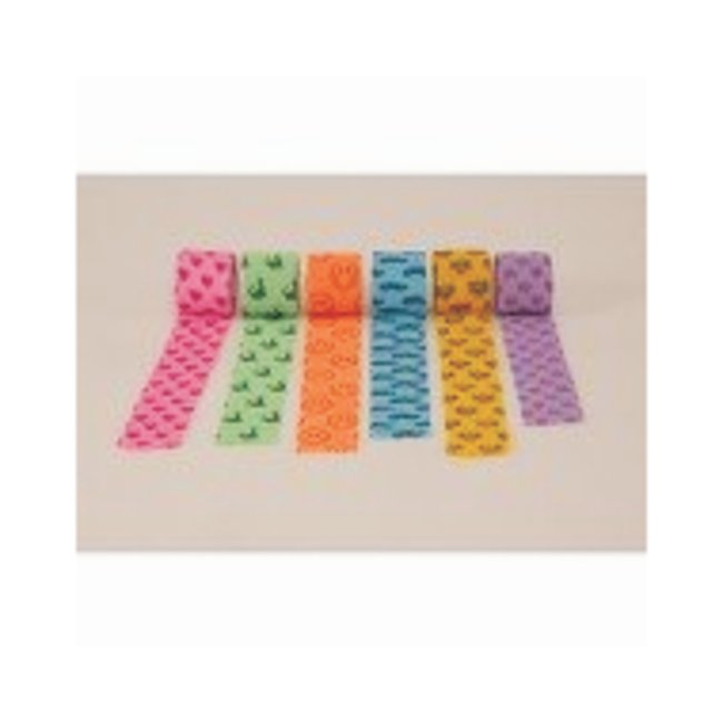 Kid-friendly designs and colorsEasyTear patented technology means no scissors neededSoft and strong so it will not slipControlled compression will not constrictEasy to apply and removeAvailable in a variety of sizesDesigns:Purple Hearts on Neon PinkBlue Dinosaurs on Neon GreenBlue Trucks and Cars on Light BlueBumblebees on YellowUS Patent 5,762,623