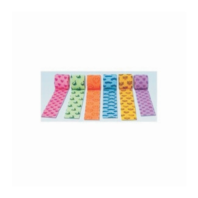 Kid-friendly designs and colorsEasyTear patented technology means no scissors neededSoft and strong so it will not slipControlled compression will not constrictEasy to apply and removeAvailable in a variety of sizesDesigns:Purple Hearts on Neon PinkBlue Dinosaurs on Neon GreenBlue Trucks and Cars on Light BlueBumblebees on YellowUS Patent 5,762,623