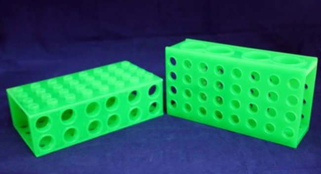 With a special design of being able to stand in four different sides, the neon green 4-way rack can hold and support different sizes of tubes. The rack can be used with four 50 ml tubes, twelve 15 ml tubes, thirty-two 1.5 or 2.0 ml tubes, or thirty-two 0.5 ml tubes. The racks can also be joined with another rack in order to support several sets of 50 and 15 ml tubes.