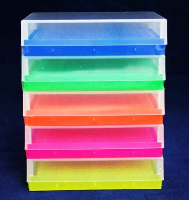 The polypropylene 96-place rack can store 0.2 ml individual and strip tubes. It can endure autoclaving and freezing temperatures of down to -90C. The transparent lid allows the racks to be stacked, which then permits the user to efficiently save space. It is sold in a pack of 5 racks in assorted neon colors of blue, green, orange, pink, and yellow with 5 natural lids.