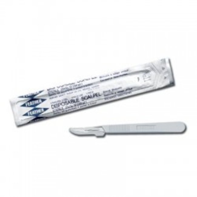 The Feather Disposable Scalpels offer the sharpest edge available, making it ideal for field use. Each scalpel is individually wrapped in aluminum wrapper to ensure its cleanliness. This product is sterile and is ready to use. It is also disposable in order to eliminate the chance of contamination. This product is in style #10.