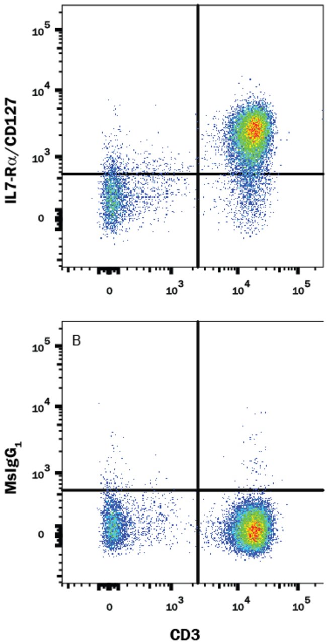 IL-7R alpha/CD127 Monoclonal specifically detects IL-7R alpha/CD127 in Human samples. It is validated for Flow Cytometry.