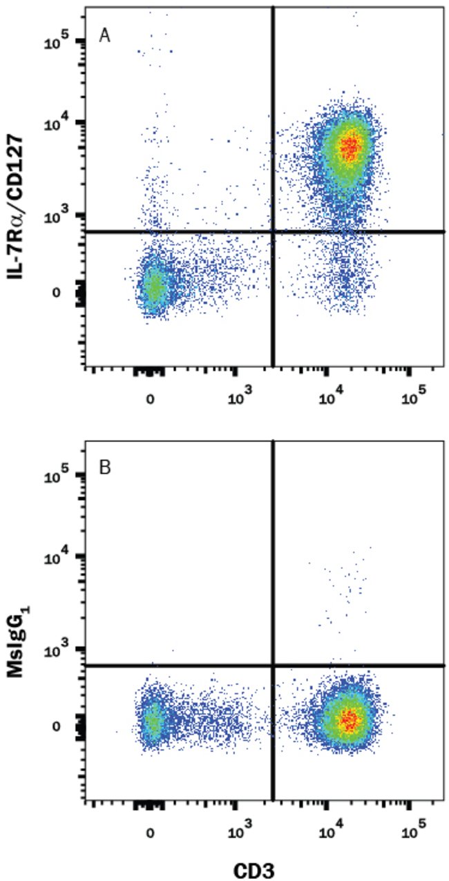 IL-7R alpha/CD127 Monoclonal specifically detects IL-7R alpha/CD127 in Human samples. It is validated for Flow Cytometry.