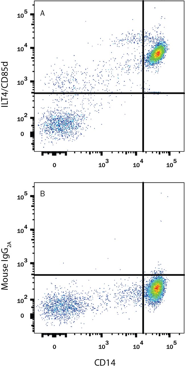 ILT4/CD85d/LILRB2 Monoclonal specifically detects ILT4/CD85d/LILRB2 in Human samples. It is validated for Flow Cytometry.