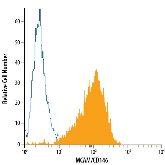 MCAM/CD146 Monoclonal specifically detects MCAM/CD146 in Human samples. It is validated for Flow Cytometry.