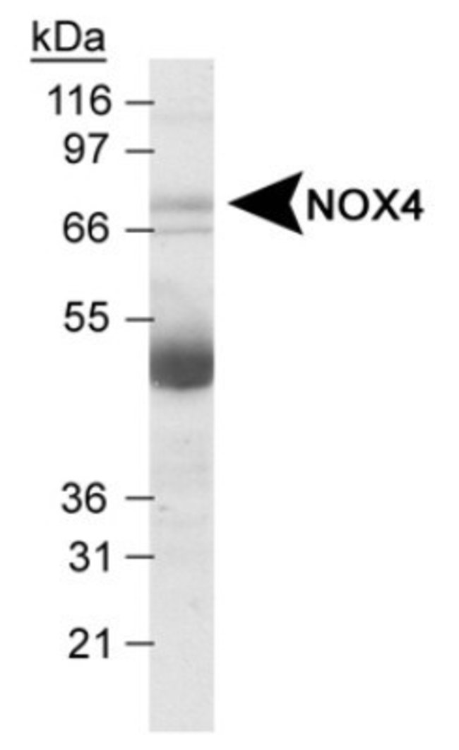 Nox4 Polyclonal specifically detects Nox4 in Human, Mouse, Rat, Porcine, Bovine, Primate, Rabbit, Sheep samples. It is validated for Western Blot, Immunohistochemistry, Immunocytochemistry/Immunofluorescence, Immunohistochemistry-Paraffin, Immunohistochemistry-Frozen, Immunoblotting, Knockdown Validated.