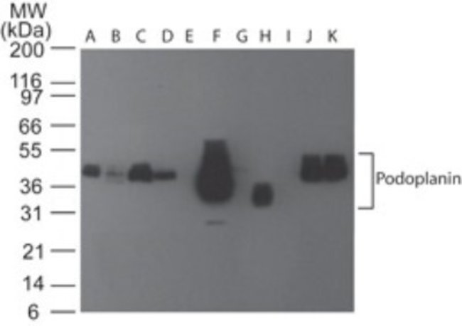 Podoplanin Monoclonal specifically detects Podoplanin in Mouse samples. It is validated for Western Blot, Flow Cytometry, CyTOF-ready.