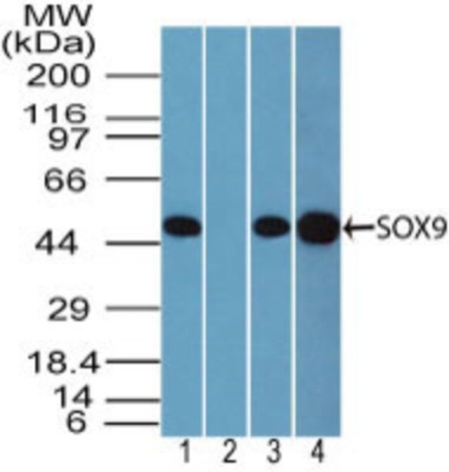 SOX9 Polyclonal specifically detects SOX9 in Human, Mouse, Rat, Canine, Feline, Goat, Primate, Sheep samples. It is validated for Western Blot, Simple Western, Immunohistochemistry, Immunohistochemistry-Paraffin, Immunohistochemistry-Frozen.