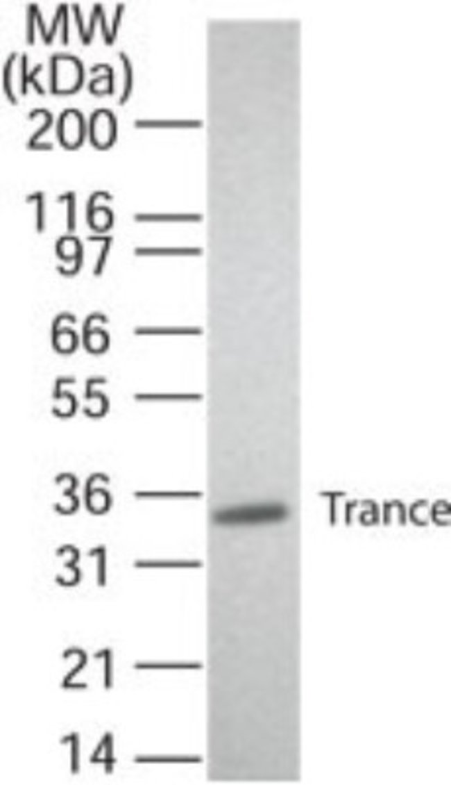 TRANCE/TNFSF11/RANK L Monoclonal specifically detects TRANCE/TNFSF11/RANK L in Human, Mouse, Rat samples. It is validated for Western Blot, Chromatin Immunoprecipitation, Flow Cytometry, Immunohistochemistry, Immunocytochemistry/Immunofluorescence, Immunohistochemistry-Paraffin, CyTOF-ready.