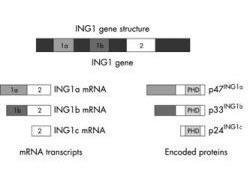 p33 ING1 [Gt] Antibody^ Chromatin. Primary Antibodies. Anti-p33 ING1 reacts against human p33 ING1 protein and is 100% homologous to all four isoforms (A B C and D) on record for this protein. Applications include ELISA WB. Size 100ug.