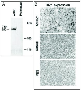 PRDM2 (RIZ1) ANTIBODY 0.1MG^ Purified recombinant GST fusion protein encoding aa 245-573 of rat Riz1. This antibody also recognizes the isoform beta (Riz2) of PRDM2 (185 kDa). Specificity: H. Concentration: 0.25 mg/ml. Size: 0.1 mg.