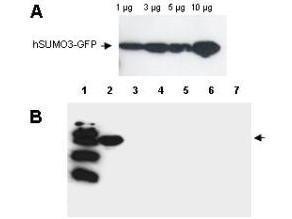 SUMO-3 [Rb] Antibody^ Ubiquitin. UBL Proteins. Primary Antibodies. Expect a band approximately 11.6 kDa in size corresponding to human SUMO-3 by western blotting in the appropriate cell lysate or extract. Applications include ELISA WB. Size 500ug.