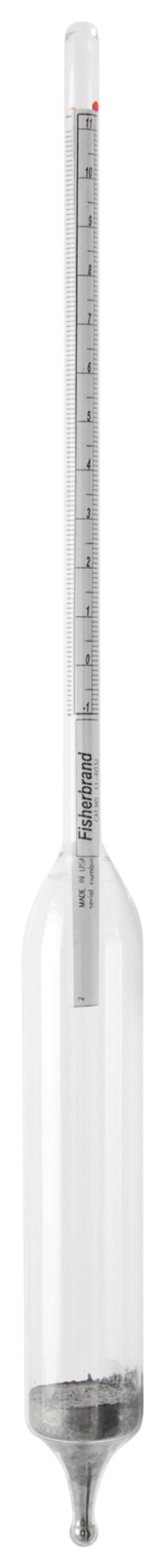 These hydrometers are manufactured to meet or exceed ASTM™ E 100 specifications which are accepted by NIST™ and U.S. Bureau of Mines.Permanently marked with individual serial numbersWithout thermometer in bodyApproximate length: 330mmTemperature of standardization: 60°FOrder InfoA certificate of calibration is available; simply add the letter “C” to the end of the catalog number when ordering.CertificationsA certificate is provided to indicate instrument traceability to standards provided by NIST.ComplianceMeet or exceed ASTM E 100 specifications which are accepted by NIST and U.S. Bureau of Mines, Calibrated according to ASTM E 126 specifications.