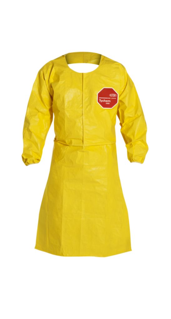 DuPont* Tychem* QC Apron^ Made of polyethylene-coated Tyvek* fabric. Provides light liquid splash protection against industrial hazards. Durable, lightweight, apron features bound seams, attached long sleeves, bound snap neck, waist ties, elastic wrists. Dimensions: 71x112cm. Yellow. Size: Medium.