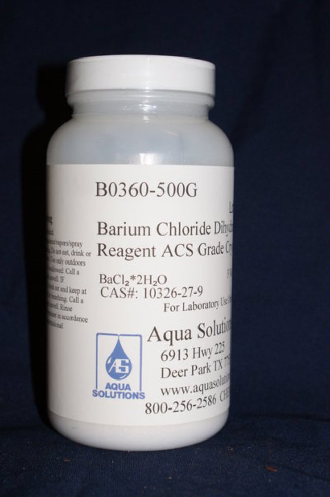 Barium Chloride Dihydrate Reagent A.C.S., Crystal; 100%; White odorless crystals; 500g; 963 deg.C; 1560 deg.C; CAS: 10326-27-9; Store in a cool dry place