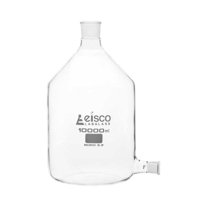 Aspirator bottle made of high quality, heavy duty, borosilicate 3.3 glass. 10,000ml capacity. 29/32 socket size outlet for a stopcock (not included) at the base of the bottle. Top ground joint has a 45/40 size socket. Bottle measures 16.5" (420mm) tall, and is 9" (228mm) in diameter.Autoclavable, with superior chemical durability. Low temperature gradient- can withstand high temperatures & thermal shocks. Eisco Labs Borosilicate glass has the following heat tolerances: Strain Point 515°C | Annealing Point 565°C | Softening Point 820°C.Eisco Labs proudly manufactures its own products using state-of-the-art equipment, and following the highest standards of quality control.Each product is carefully designed by a team of laboratory professionals and experienced engineers with quality and durability in mind. They are manufactured with only the highest grade, raw materials and according to international quality standards to ensure that they can withstand use in even the toughest laboratory environments.