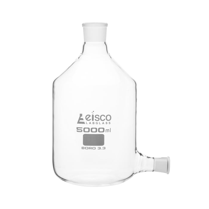 Aspirator bottle made of high quality, heavy duty, borosilicate 3.3 glass. 5,000ml capacity. 29/32 socket size outlet for a stopcock (not included) at the base of the bottle. Top ground joint has a 34/35 size socket. Bottle measures 12.8" (325mm) tall, and is 7" (180mm) in diameter.Autoclavable, with superior chemical durability. Low temperature gradient- can withstand high temperatures & thermal shocks. Eisco Labs Borosilicate glass has the following heat tolerances: Strain Point 515°C | Annealing Point 565°C | Softening Point 820°C.Eisco Labs proudly manufactures its own products using state-of-the-art equipment, and following the highest standards of quality control.Each product is carefully designed by a team of laboratory professionals and experienced engineers with quality and durability in mind. They are manufactured with only the highest grade, raw materials and according to international quality standards to ensure that they can withstand use in even the toughest laboratory environments.