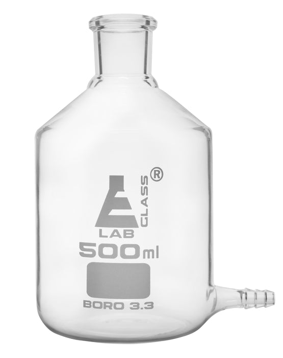 Aspirator bottle made of high quality, heavy duty, 3.3 borosilicate glass. 500ml capacity. Outlet for tubing located at the base of the bottle. Bottle measures 6.25" in total height, and has a diameter of 3.5". Bottle neck has an inner diameter of 23mm, and the beaded rim measures 34mm. Outlet tubing measures 1.1" long, and has an inner diameter of 4mm, and an outer diameter of 8mm. Eisco Labs Borosilicate glass has the following heat tolerances: Strain Point -515°C | Annealing Point 565°C | Softening Point 820°C