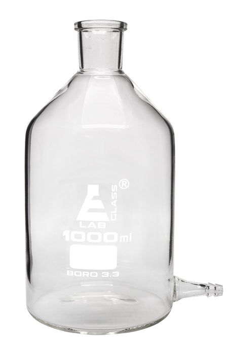 Aspirator bottle with outlet for tubing. 1000ml capacity. Flask measures 8.25" tall, and 4.25" in diameter. Inner diameter of neck measures 1". Tubing outlet measures 1.5" long, has an outer diameter 7mm, and an inner diameter of 4mm.Eisco Labs Borosilicate glass has the following heat tolerances: Strain Point -515°C | Annealing Point 565°C | Softening Point 820°C.