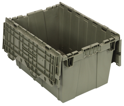 Attached lid container^ Containers medium, 21inx 15inx 12in, attached lid with a permanently attached lids, ideal for storage, distribution, and order picking. stack for maximized stoage and nest when not in use