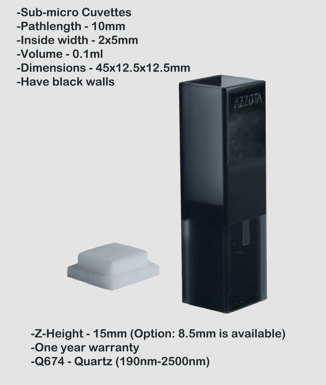 10mm Pathlength (0.1ml) Sub-micro Cuvettes Pathlength - 10mm Inside width - 2x5mm Volume - 0.1ml Dimensions - 45x12.5x12.5mm Have black walls Z-Height - 15mm (Option: Z=8.5mm is available) Quartz (190nm-2500nm)