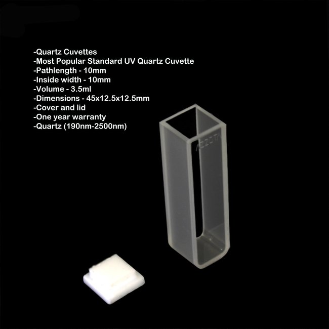 10mm Pathlength Standard IR Cuvettes – 3.5ml - Pathlength 10mm – Volume 3.5ml – Dimensions 12.5 x 12.5 x 45 mm; Glass/plastic lid and plastic box, Quartz (250 to 3500 nm)