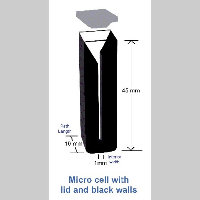 10mm Pathlength Standard Cuvettes – 0.35ml - Pathlength 10mm - Inside width 1mm – Volume 0.35ml – Dimensions 45x12.5x12.5mm; Cover and black walls Quartz (340nm-2500nm)