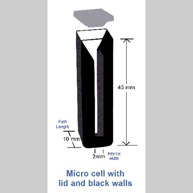 10mm Pathlength Micro Cuvettes – 0.7ml - Pathlength 10mm - Inside width 2mm – Volume 0.7ml – Dimensions 45x12.5x12.5mm; Cover and black walls, Glass (340nm-2500nm)