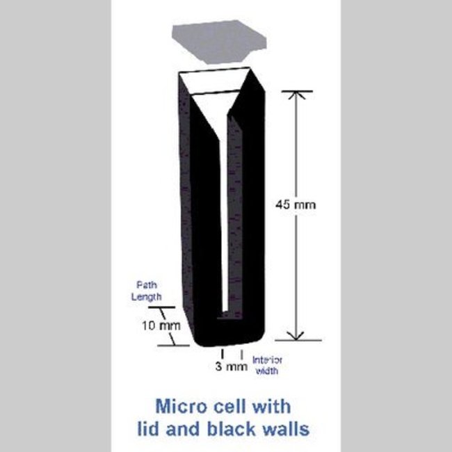 10mm Pathlength Micro Cuvettes – 1ml - Pathlength 10mm - Inside width 3mm – Volume 1.0ml – Dimensions 45x12.5x12.5mm; Cover and black walls, Quartz (190nm-2500nm)