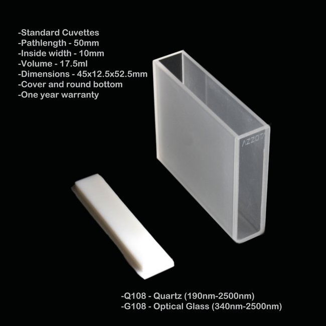 50mm Pathlength Standard Cuvettes - 17.5ml Pathlength - 50mm Inside width - 10mm Volume - 17.5ml Dimensions - 45x12.5x52.5mm Cover and round bottom Quartz (190nm-2500nm)