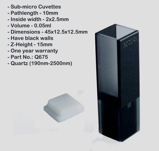 10mm Pathlength (0.05Ml) Sub-Micro Cuvette Pathlength - 10mm Inside Width - 2X2.5mm Volume - 0.05Ml Dimensions - 45X12.5X12.5mm Have Black Walls Z-Height - 15mm Quartz (190Nm-2500Nm), Each