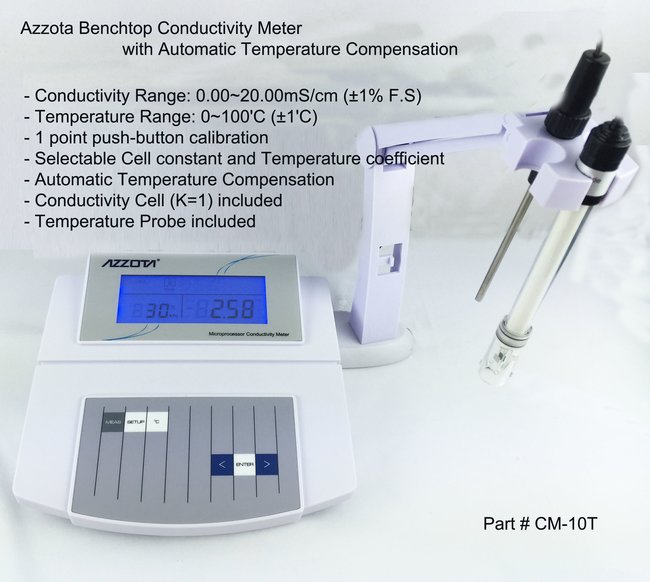 Benchtop Conductivity Meter with Temperature Conductivity Range: 0.05 - 2x105 uS/cm Temperature Range: 0-100deg.C Temperature Compensation: 0-40deg.C Temperature: Coefficient: 0-5% per deg.C Dimension: 210mm x 205mm x 65mm