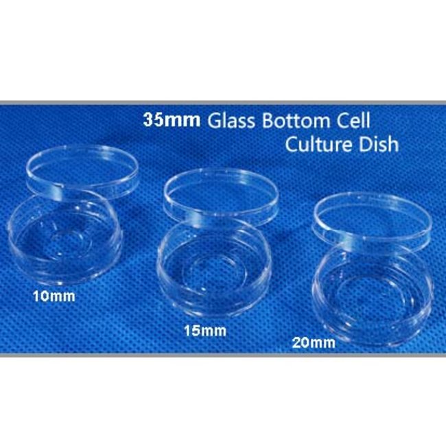 35mm Glass Bottom Culture Dish, PS Material, thin and optically clear bottom. Round cover glass, 1.77 cm2 Growth Area, Glass Bottom Diameter 15mm. Dia 3.4x1.2 mm, Package of 10