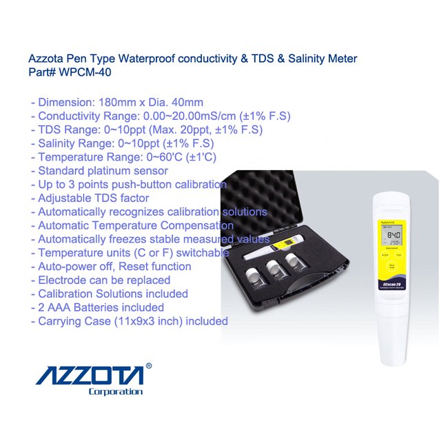 Pen Type Conductivity Meter with Temp. Conductivity Range: 0.0~19.99 mS/cm Conductivity Accuracy: /- 1.0% Full Scale Display: 0.01mS/cm Calibration Points: 1 points Temp compensate: 2%/C