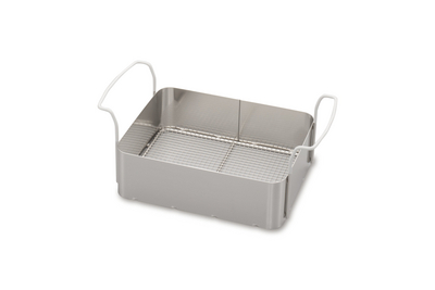 Basket for the Elmasonic E Plus 100H ultrasonic cleaner^ Basket, Material: stainless steel, for the Elmasonic E Plus 100H ultrasonic cleaner has insulated handles, solid sides, a mesh bottom, internal dimensions of (LxWxH): 10.0 x 7.9 x 3.0 inches