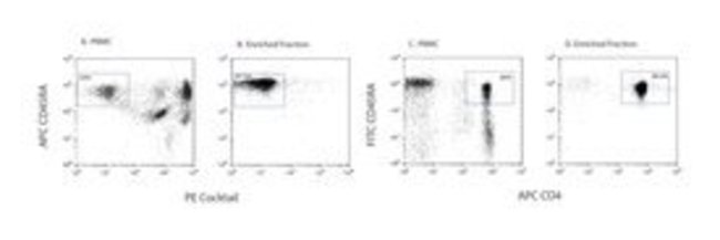Contains biotinylated monoclonal antibodies that recognize antigens expressed on naive T cells, CD8+ T cells, B cells, NK cells, Γ/δ T cells, monocytes, DCs, granulocytes, platelets, and erythroid cellsNegative selection is performed to enrich for unlabeled memory cells. Labeled cells migrate towards magnet (positive fraction), leaving the unlabeled cells in suspension so they can be drawn off and retained (enriched fraction)Contains biotinylated monoclonal antibodies that recognize antigens expressed on naive T cells, CD8+ T cells, B cells, NK cells, γ/δ T cells, monocytes, DCs, granulocytes, platelets, and erythroid cellsAvoids inadvertent activation of enriched memory helper T cells by using reagents that do not directly bind to those T cellsSimultaneously stains erythrocytes, platelets, and most leukocytesFlow cytometry