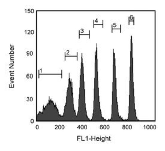 For flow cytometry calibration and alignmentHave emission spectra compatible with many common fluorophores used for immunofluorescent staining with flow cytometric analysisVery small coefficients of variation in both size and fluorescenceContain water insoluble fluorescent dyes which are very stable, allowing them to be sterilized by washing with 70% alcoholProvided in convenient dropper bottles containing 5mL of particle suspension at a concentration of 107 particles/mLPolystyreneRainbow Calibration Particles (6 Peaks)Each vial contains a mixture of Rainbow Particles that are dyed to six different fluorescent intensitiesRainbow Calibration Particles (8 Peaks)The vial contains a mixture of Rainbow Particles that are dyed to eight different fluorescent intensitiesRainbow Fluorescent Particles (High Intensity)Each vial contains a single population of Rainbow Particles that are dyed to a single fluorescent intensityThe intensity of this particle corresponds to the brightest intesity of peak in the Rainbow Calibration Particles, 3.0-3.4μm (Mfr. No. 556286)Rainbow Fluorescent Particles (Mid-range FL1 Fluorescence)Each vial contains a single population of Rainbow Particles that are dyed to a single fluorescent intensityBlank Calibration ParticlesEach vial contains a single population of Blank Calibration Particles that are dyed to a single fluorescent intensityThe intensity of this particle corresponds to the dimmest intensity peak in the Rainbow Calibration Particles (6 Peaks), 6.0-6.4μm (Mfr. No. 5556288)Approximate the background fluorescence of unstained cell