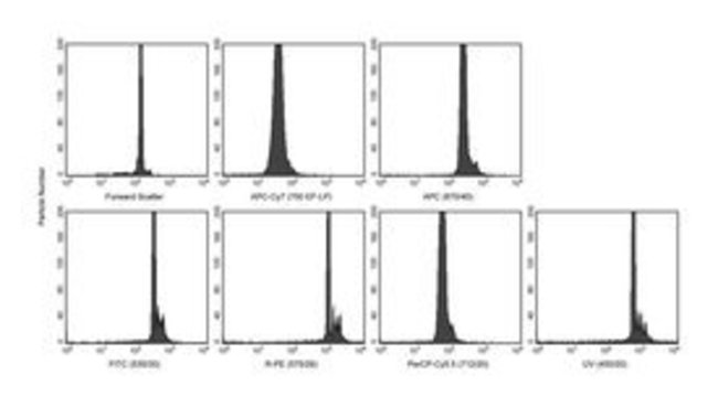 For flow cytometry calibration and alignmentHave emission spectra compatible with many common fluorophores used for immunofluorescent staining with flow cytometric analysisVery small coefficients of variation in both size and fluorescenceContain water insoluble fluorescent dyes which are very stable, allowing them to be sterilized by washing with 70% alcoholProvided in convenient dropper bottles containing 5mL of particle suspension at a concentration of 107 particles/mLPolystyreneRainbow Calibration Particles (6 Peaks)Each vial contains a mixture of Rainbow Particles that are dyed to six different fluorescent intensitiesRainbow Calibration Particles (8 Peaks)The vial contains a mixture of Rainbow Particles that are dyed to eight different fluorescent intensitiesRainbow Fluorescent Particles (High Intensity)Each vial contains a single population of Rainbow Particles that are dyed to a single fluorescent intensityThe intensity of this particle corresponds to the brightest intesity of peak in the Rainbow Calibration Particles, 3.0-3.4μm (Mfr. No. 556286)Rainbow Fluorescent Particles (Mid-range FL1 Fluorescence)Each vial contains a single population of Rainbow Particles that are dyed to a single fluorescent intensityBlank Calibration ParticlesEach vial contains a single population of Blank Calibration Particles that are dyed to a single fluorescent intensityThe intensity of this particle corresponds to the dimmest intensity peak in the Rainbow Calibration Particles (6 Peaks), 6.0-6.4μm (Mfr. No. 5556288)Approximate the background fluorescence of unstained cell
