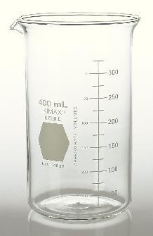 KIMAX* brand Berzelius Beakers, Tall Form, Graduated^ 600ml, with pouring spout. Graduation range: 50-500ml. Reverse graduation: 0-450ml. Top is slightly flared with a thick reinforcing bead. Durable matte-finish area for marking with pencil. Designed from ASTM Specification E960, Type III.