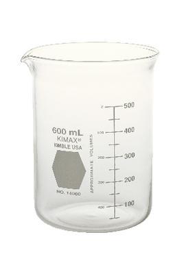 KIMAX* brand Griffin Beakers, Graduated^ 100ml. Graduation range: 20-80ml. Borosilicate glass for resistance to wear and chemical attack. Thick, beaded top is slightly flared and walls have uniform thickness. An enameled area allows pencil marking. Meets NNN-B-175 and ASTM E960.