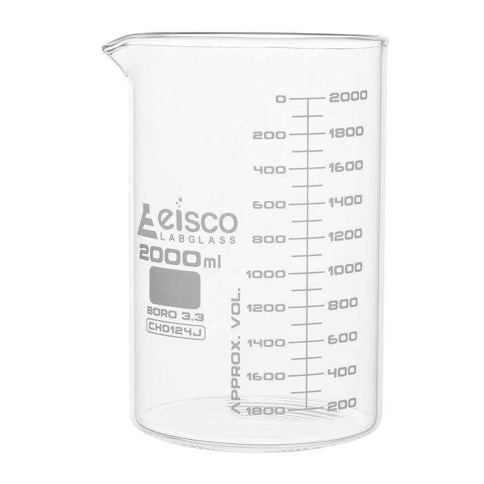 ull; INDUSTRIAL STRENGTH || Made of high quality, heavy duty, Borosilicate 3.3 glass. Excellent strength against breakage. Designed for use in professional laboratories, but is ideal for classroom, garage and home use • 2000ML CAPACITY || Beaker has a 2000ml capacity and features white printed graduation lines every 100ml • ASTM || Beaker features dual scale graduations, as per ASTM-E960 • SUPERIOR HEAT & CHEMICAL DURABILITY || Microwavable and autoclavable, with superior chemical durability. Low temperature gradient- can withstand high temperatures & thermal shocks • MANUFACTURED BY EISCO LABS || Eisco Labs proudly manufactures its own products using state-of-the-art equipment, and following the highest standards of quality control. Each product is carefully designed by a team of laboratory professionals and experienced engineers with quality and durability in mind 2000ml capacity, low form beaker made of Borosilicate 3.3 Glass. Beaker features a dual graduation scale, as per ASTM-E960, with graduation lines every 100ml. Spout for easy pouring. Uniform walls provide excellent strength against breakage. Beaker stands 7.9" tall, and has an inner diameter of 127mm and an outer diameter of 130mm. Eisco Labs Borosilicate glass has the following heat tolerances: Strain Point -515°C | Annealing Point 565°C | Softening Point 820°C. Eisco Labs proudly manufactures its own products using state-of-the-art equipment, and following the highest standards of quality control. Each product is carefully designed by a team of laboratory professionals and experienced engineers with quality and durability in mind. They are manufactured with only the highest grade, raw materials and according to international quality standards to ensure that they can withstand use in even the toughest laboratory environments.