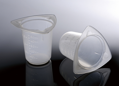 Tri-Cornered Beaker 50ml^ Tri-Cornered Beaker, Materials: Strong, medical-grade Polypropylene, three dripless pouring spouts, with good impact strength and are translucent and autoclavable, disposable and easy to clean and durable enough for reuse, with Molded Graduations, Clear, Capacity: 50 ml