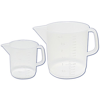 PolypropyleneMolded graduations - in litersLow form for added stabilityAutoclavable; use up to 135°CAutoclavable, highly translucent especially when filled with liquids. Permanent molded in graduations. Resistant. No drip spout. Thumb grip on handle.