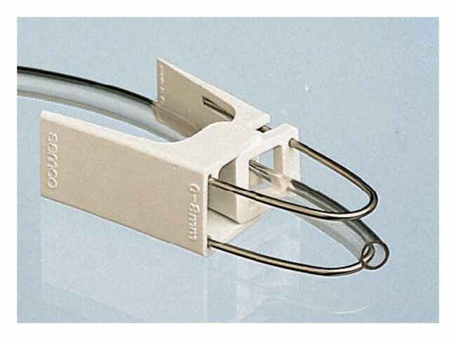 Positive-action clamp opens by squeezing handles together Naturally clamps shut to stop flow Chemical- and stain-resistant Made of Acetal plastic and stainless steel