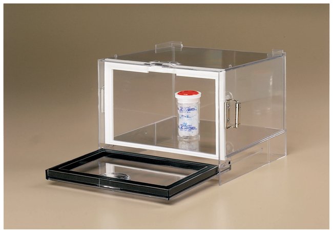 Injection-molded high-impact polystyrene cabinet.Strong, rigid, and airtightCompletely transparent for full visibility from any sideDoor slides into a compartment underneath the cabinet when openMay be stacked up to five cabinets highShipped with a jar of silica gel desiccantOrder InfoOverall dimensions: 9 1/4 × 8 7/8 × 6 5/8 in. (23 × 22 × 17cm). Inside dimensions: 8 1/4 × 7 × 5 in. (21 × 18 × 13cm). Door opening: 7 1/2 × 4 3/8 in. (19 × 11cm).