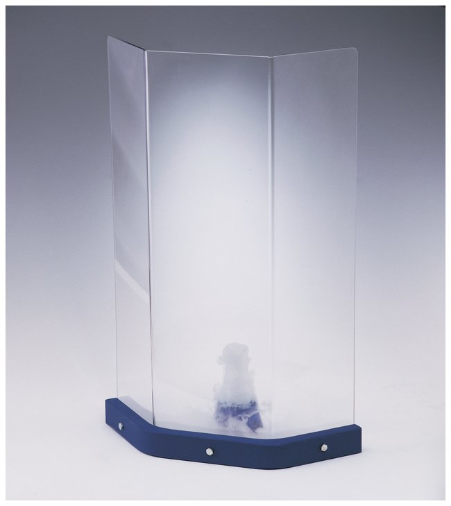 Transparent shield provides high-impact resistance.Laboratory workers are protected by a 0.188 in. (4.7mm) thick clear, polycarbonate barrierStable three-sided construction provides front and side protection against flying debrisHeavy steel perimeter base is coated with blue epoxyPlated steel bolts, nuts and washers used for assemblyOutside base measures 19.5 in. (50cm) and 6.5 in. (17cm) front to backShields meet High Mass Impact Test and High Velocity Impact Test as defined by ANSI Z87.1, sections 9.11 and 9.12, respectively