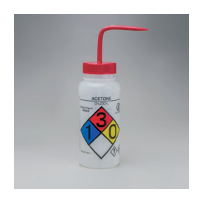 Specially designed valve prevents pressure build-up, which eliminates potentially dangerous chemical drips; allows dispensing of wash bottle in upright or inverted position.