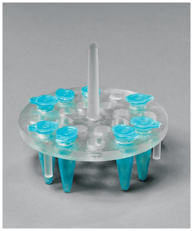 Made especially for use in beakers—incubate eight to twenty 1.5mL tubes in a beaker of waterMolded of buoyant polymethylpentene with tiny bubbles throughout for additional buoyancyRacks fill at top; tubes remove easily by pressing rack down on bench until legs touch and release tubesTube holes arranged in circular pattern with center rod handleSteam autoclavable at 121°C (250°F); can be boiled at 100°C (212°F) for 30 minute